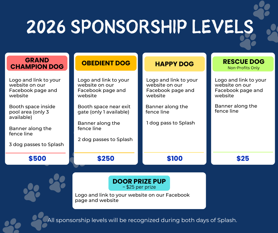 We have opportunities available such as registration table, dog holders, gate guards, and pool watch, among other duties. Each session is a 3-hour commitment, and when you sign up for 2 spots, you (or someone on your behalf) can bring your dog to the event at no charge. Snacks and beverages will be provided, and if you sign up for all day, lunch is on us! All volunteers will also have an opportunity to be put in a drawing to win one of 10–$25 Visa gift cards.